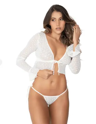¡Descubre el encanto y la sensualidad con la Lencería Blusa y Tanga Cuarzo Lerot SM – Tu Erótica! Esta hermosa combinación está diseñada para hacerte sentir espectacular y resaltar lo mejor de ti. La blusa de malla blanca marfil, adornada con mangas largas estilo bolero, se ajusta perfectamente al pecho, brindando un toque de elegancia que enamorará. Complementada con un mini tanga, este conjunto redefine la lencería íntima con un giro audaz.